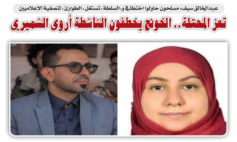 أقدمت عصابة تابعة لخونج التحالف في مدينة تعز المحتلة، اليوم، على اختطاف الناشطة والإعلامية أروى الشميري ونقلها إلى السجن المركزي، ضمن تكثيف الخونج لحملتهم ضد الناشطين والصحفيين في المدينة المحتلة. وق ...