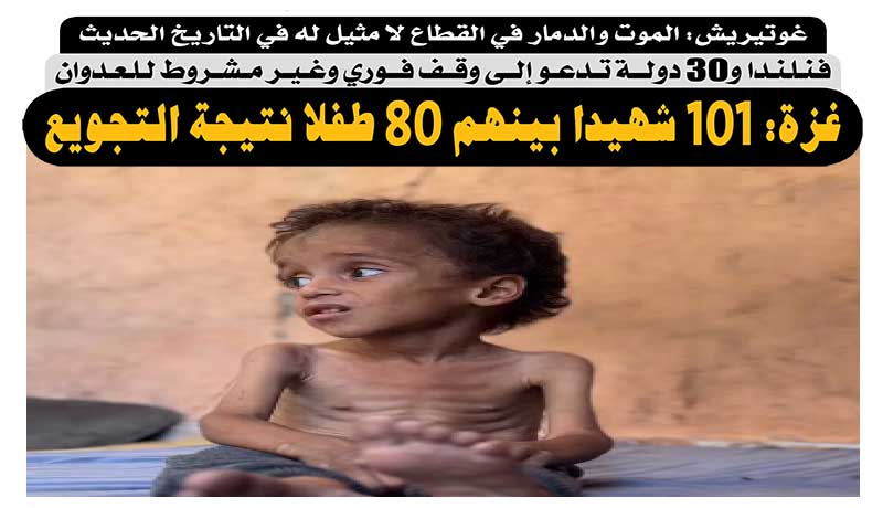 فنلندا و30 دولة تدعو إلى وقف فوري وغير مشروط للعدوان.. غزة: 101 شهيدا بينهم 80 طفلا نتيجة التجويع