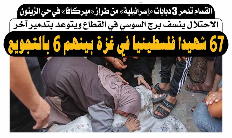 الاحتلال ينسف برج السوسي في القطاع ويتوعد بتدمير آخر.. 67 شهيدا فلسطينيا في غزة بينهم 6 بالتجويع