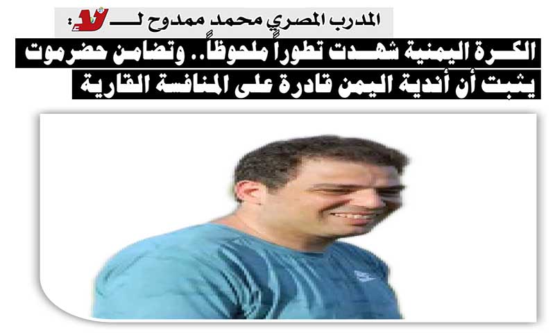 المدرب المصري محمد ممدوح لـ"لا":الكـرة اليمنية شهدت تطوراً ملحوظاً.. وتضامن حضرموت يثبت أن أندية اليمن قادرة على المنافسة القارية