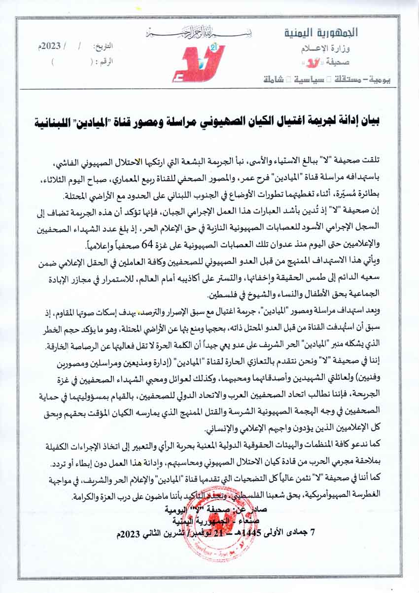 أدانت صحيفة "لا"، وبأشد العبارات، الجريمة البشعة التي ارتكبها الاحتلال الصهيوني، باغتيال مراسلة قناة "الميادين" فرح عمر، والمصور الصحفي للقناة ربيع المعماري، اليوم، بطائرة مُسيّرة، أثناء تغطيتهما تطورات الأوضاع في الجنوب اللبناني على الحدود مع الأراضي المحتلة.