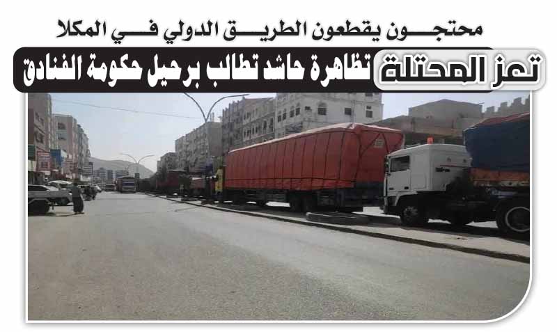 محتجون يقطعون الطريق الدولي في المكلا.. تعز المحتلة: تظاهرة حاشد تطالب برحيل حكومة الفنادق