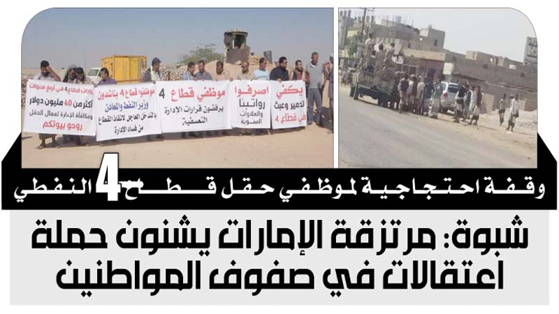 وقفة احتجاجية لموظفي حقل قطاع 4 النفطي .. شبوة: مرتزقة الإمارات يشنون حملة اعتقالات في صفوف المواطنين