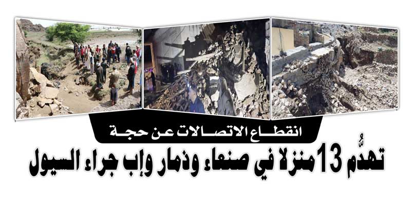 الـمــزيـدتهدمت 13 منزلا في صنعاء وذمار وإب جراء سيول الأمطار التي منّ الله بها على اليمن هذه الأيام. وقالت م. .