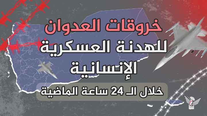 الـمــزيـدارتكبت قوى العدوان ومرتزقتها 73 خرقاً للهدنة الإنسانية والعسكرية، خلال الـ 24 ساعة الماضية. وأوضح. .