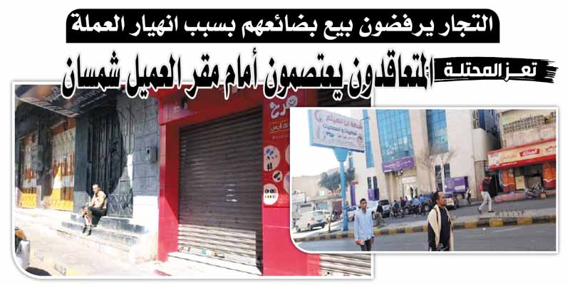 التجار يرفضون بيع بضائعهم بسبب انهيار العملة .. «تعز المحتلة»:المتعاقدون يعتصمون أمام مقر العميل شمسان