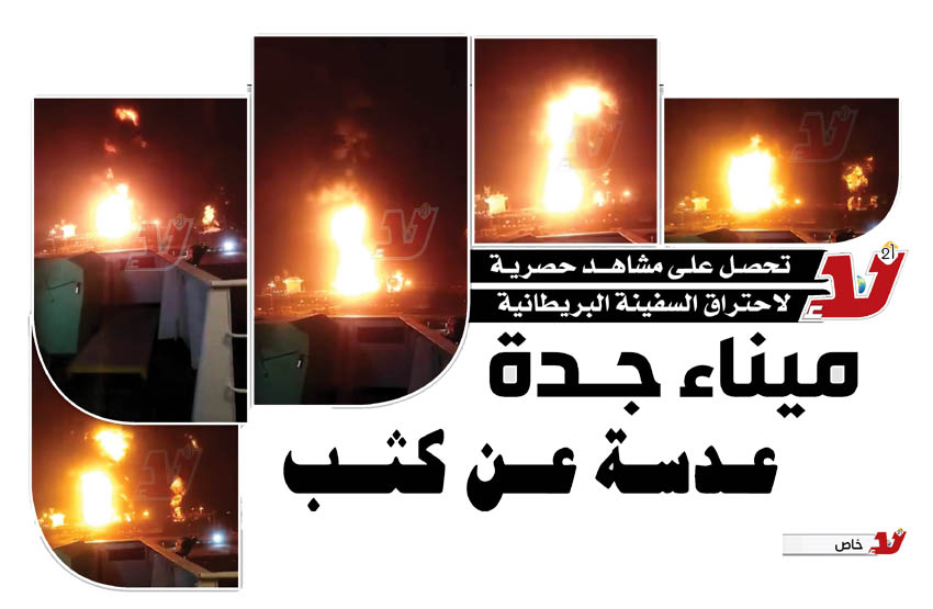 صحيفة «لا» تحصل على مشاهـد حصرية لاحتراق السفينة البريطانية .. «ميناء جدة عدسة عن كثب»
