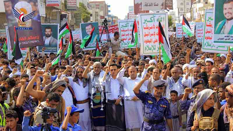 احتشد أبناء محافظة الحديدة، اليوم، في 30 ساحة بمركز ومديريات المحافظة لتجديد التضامن مع الشعب الفلسط. .