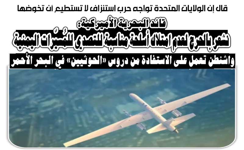 قائد البحرية الأميركية:نشعر بالحرج لعدم امتلاك أسلحة مناسبة للتصدي للمُسيّرات اليمنية