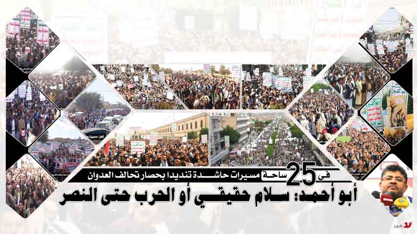 في 25 ساحة مسيرات حاشدة تنديدا بحصار تحالف العدوان .. أبو أحمد: سلام حقيقي أو الحرب حتى النصر