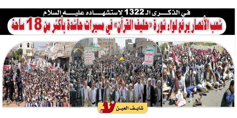 في الذكرى الـ 1322 لاستشهاده عليه السلام.. شعب الأنصار يرفع لواء ثورة «حليف القرآن» في مسيرات حاشدة بأكثر من 18 ساحة