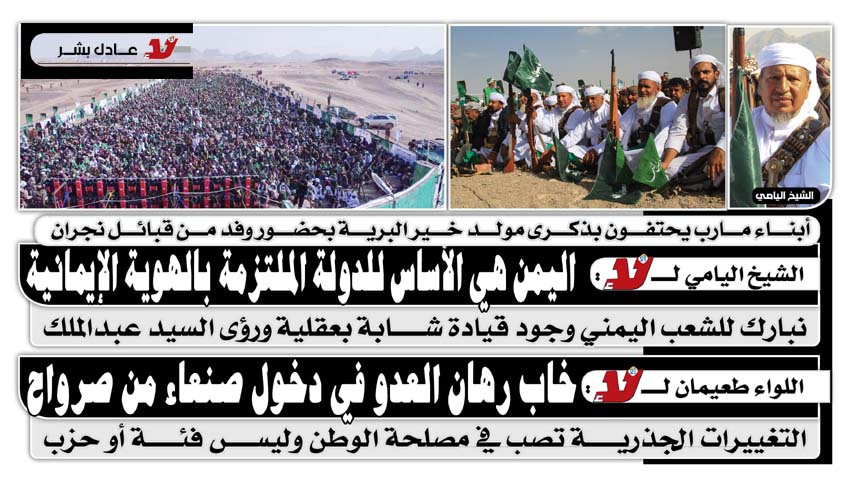 أبناء مارب يحتفون بذكرى مولد خير البرية بحضور وفد من قبائل نجران ..الشيخ اليامي لـ«لا»:اليمن هي الأساس للدولة الملتزمة بالهوية الإيمانية