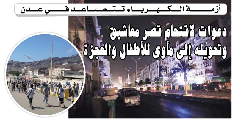 أزمة الكهرباء تتصاعد فـي عدن.. دعوات لاقتحام قصر معاشيق وتحويله إلى مأوى للأطفال والعجزة