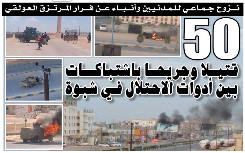نزوح جماعي للمدنيين وأنباء عن فرار المرتزق العولقي... 50 قتيلا وجريحا باشتباكات بين أدوات الاحتلال في شبوة