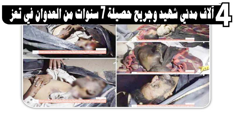 الـمــزيـدأكد تقرير حقوقي استشهاد وإصابة أكثر من 4 آلاف مدني، بينهم أطفال ونساء، في محافظة تعز خلال سبع سنوات . .