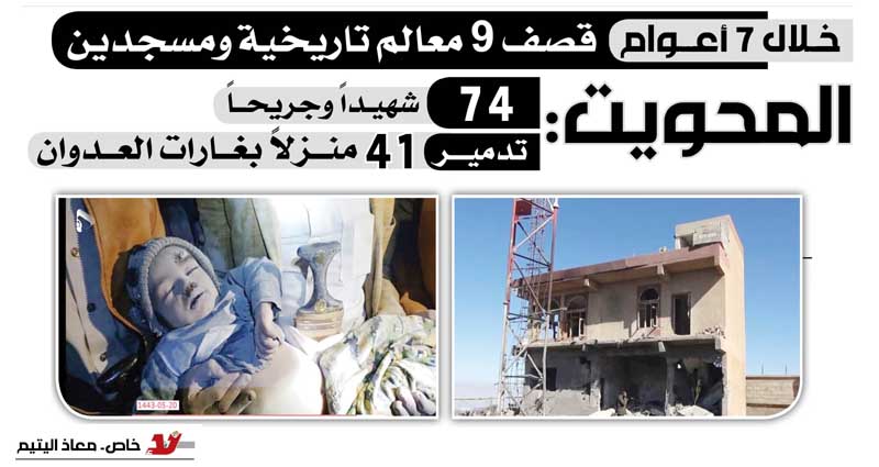خلال 7 أعوام قصف 9 معالم تاريخية ومسجدين.. المحويت: ٧٤ شهيداً وجريحاً و تدمير ٤١ منزلاً بغارات العدوان