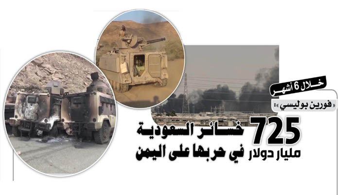 الـمــزيـدكشفت مجلة فورين بوليسي الأمريكية أن خسائر السعودية في حربها على اليمن تتجاوز 725 مليار دولار خلال 6 . .
