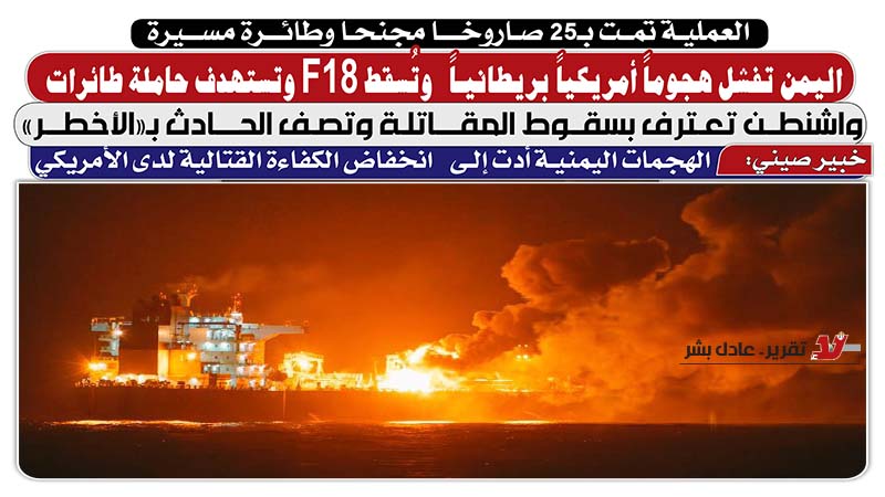 العملية تمت بـ25 صاروخا مجنحا وطائرة مسيرة.. اليمن تفشل هجوماً أمريكياً بريطانيـاً وتُسقط F18 وتستهدف حاملة طائرات