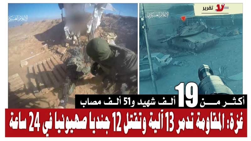 أكثر من 19 الف شهيد و51 مصاب.. المقاومة تدمر 13 آلية وتقتل 12 جندي صهيوني في 24 ساعة