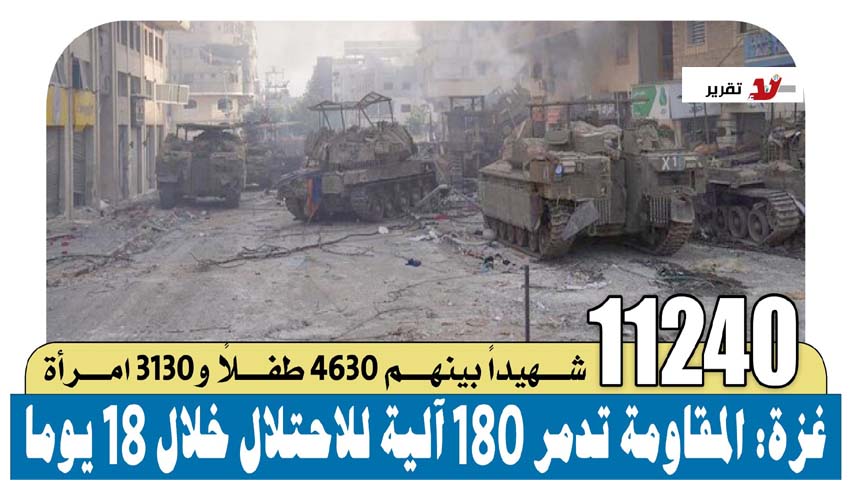 11240 شهيداً بينهم 4630 طفلاً و3130 امرأة.. غزة: المقاومة تدمر 175 آلية للاحتلال خلال 18 يوما