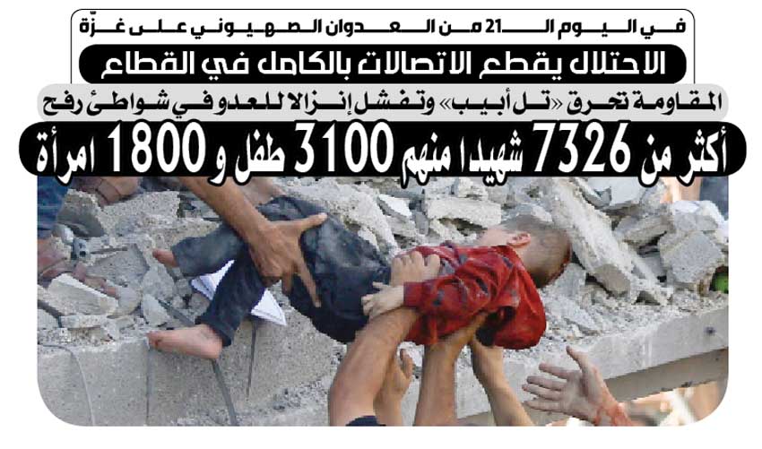 المقاومة تحرق «تل أبيب» وتفشل إنزالا للعدو فـي شواطئ رفح.. أكثر من 7326 شهيدا منهم 3100 طفل و 1800 امرأة