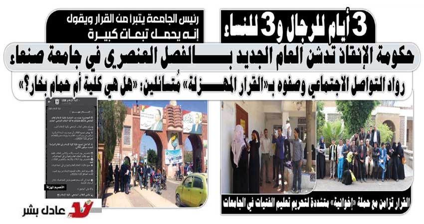 3 أيام للرجال و3 للنساء .. حكومة الإنقاذ تدشن العام الجديد بالفصل العنصري في بجامعة صنعاء