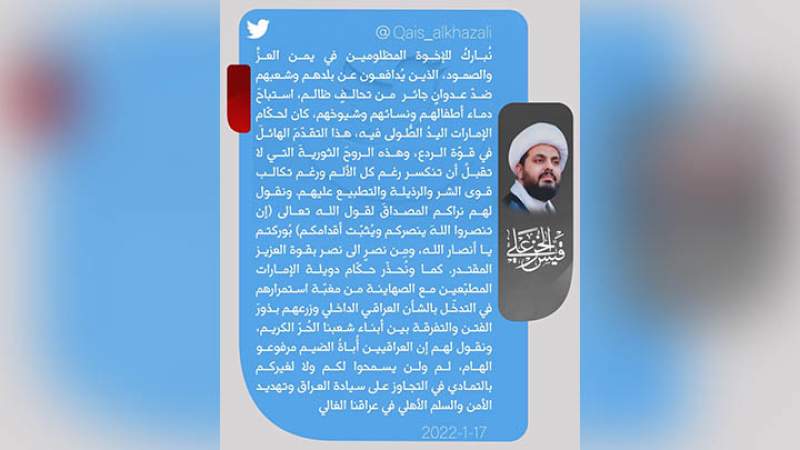 الـمــزيـدبارك الأمين العام لحركة عصائب أهل الحق العراقية الشيخ قيس الخزعلي لليمنيين تطور قوة الردع لديهم اضاف. .